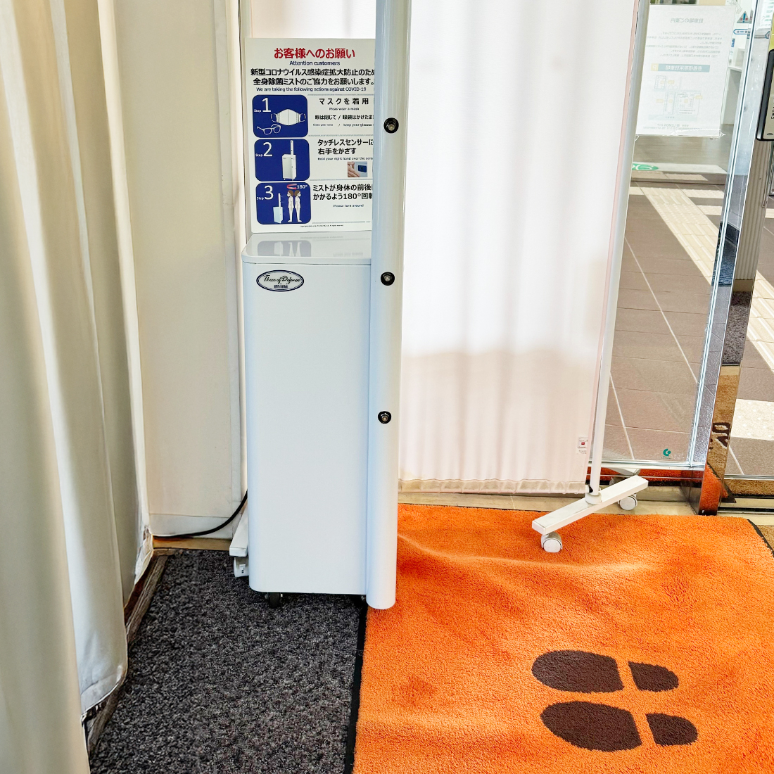 当院入り口に据え置き型噴霧装置として設置しておりますので、来院の際にご使用ください。着用したマスクや衣服にも除菌効果があり、効果は長時間持続します。